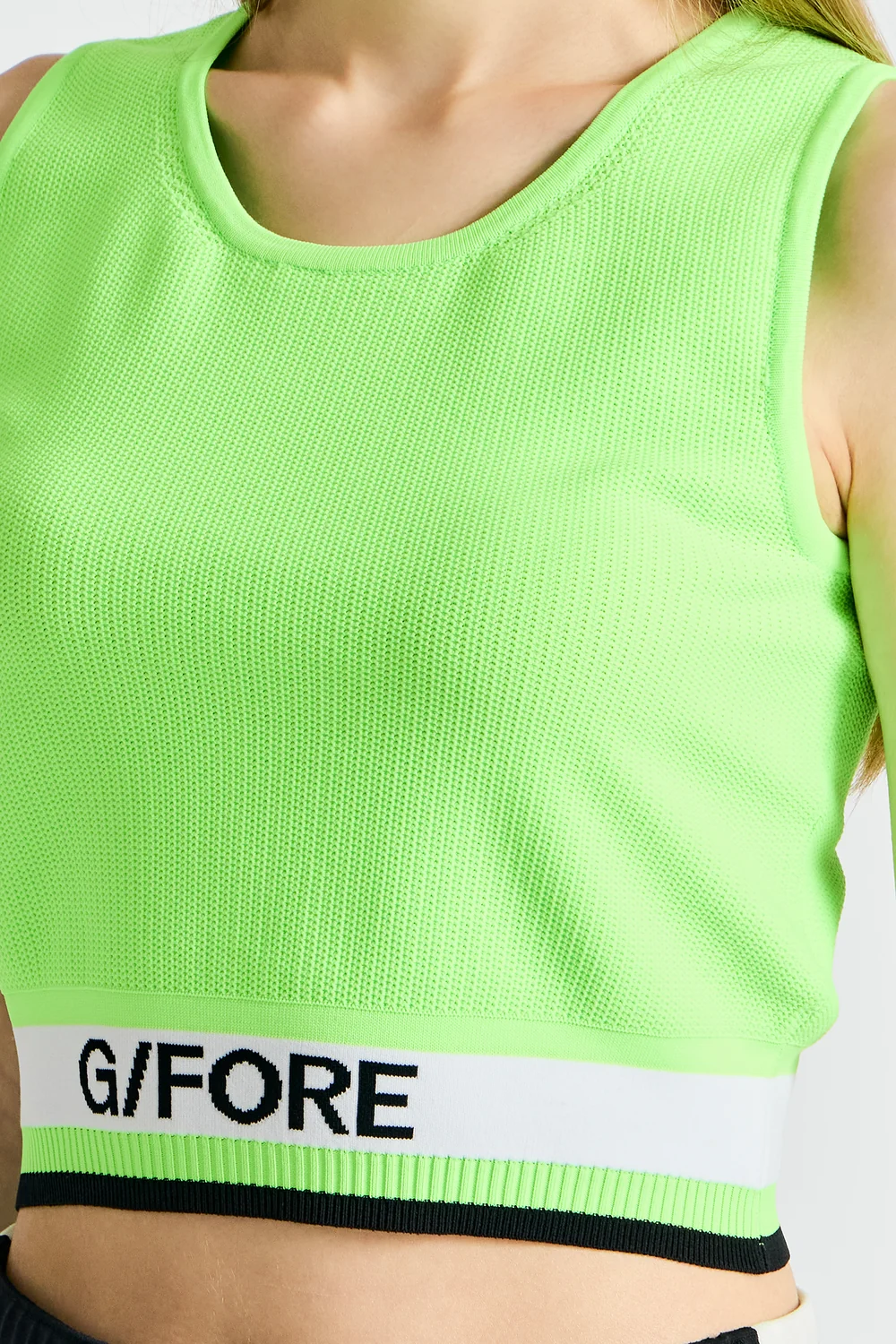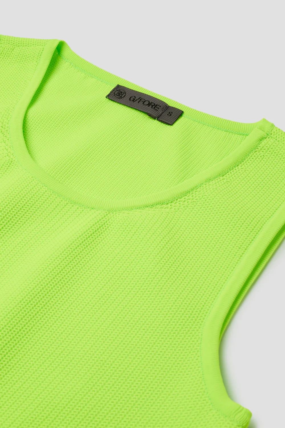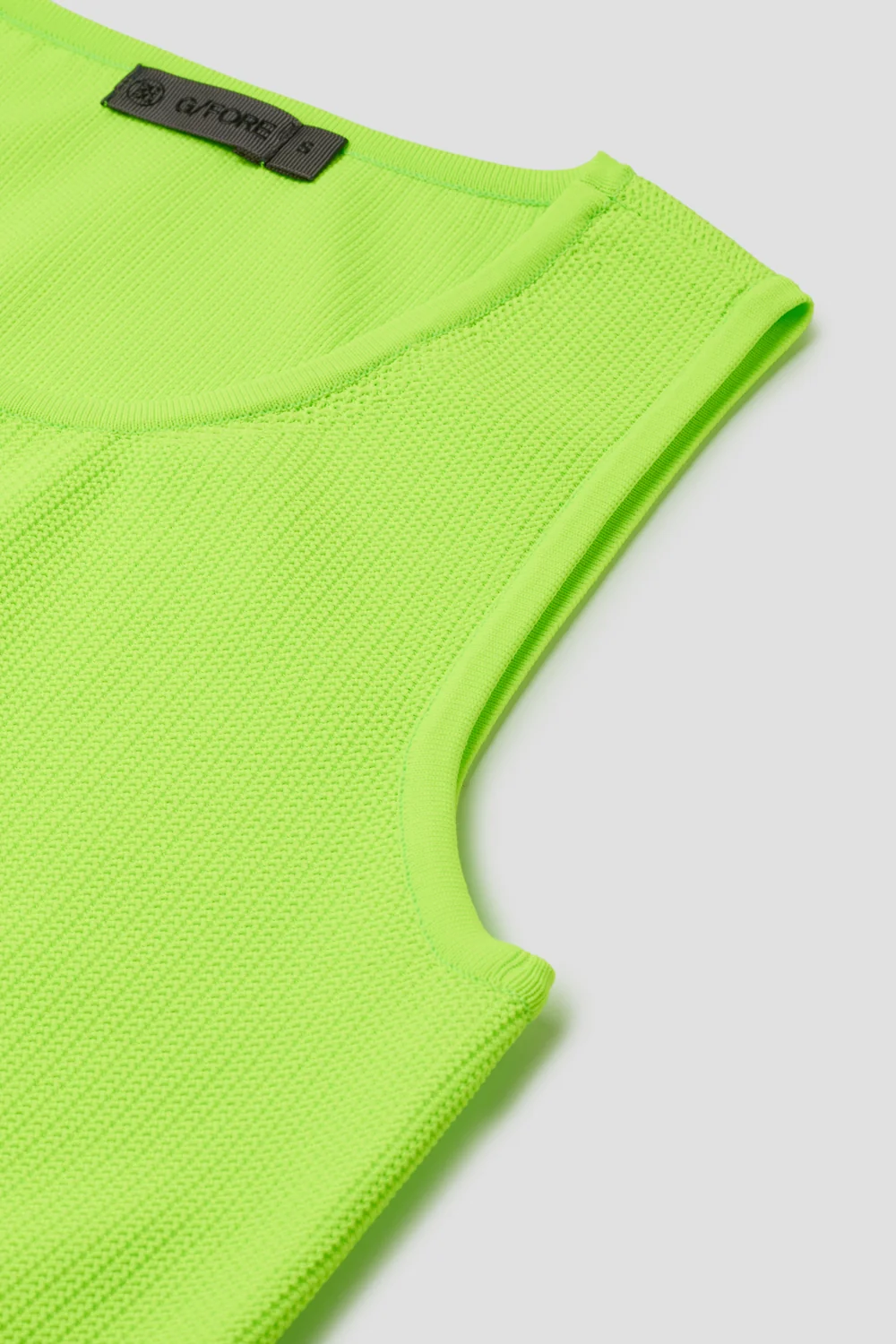 전체 이중 메쉬 조직으로 제작된 크루넥 디자인의 슬리브리스 스웨터.