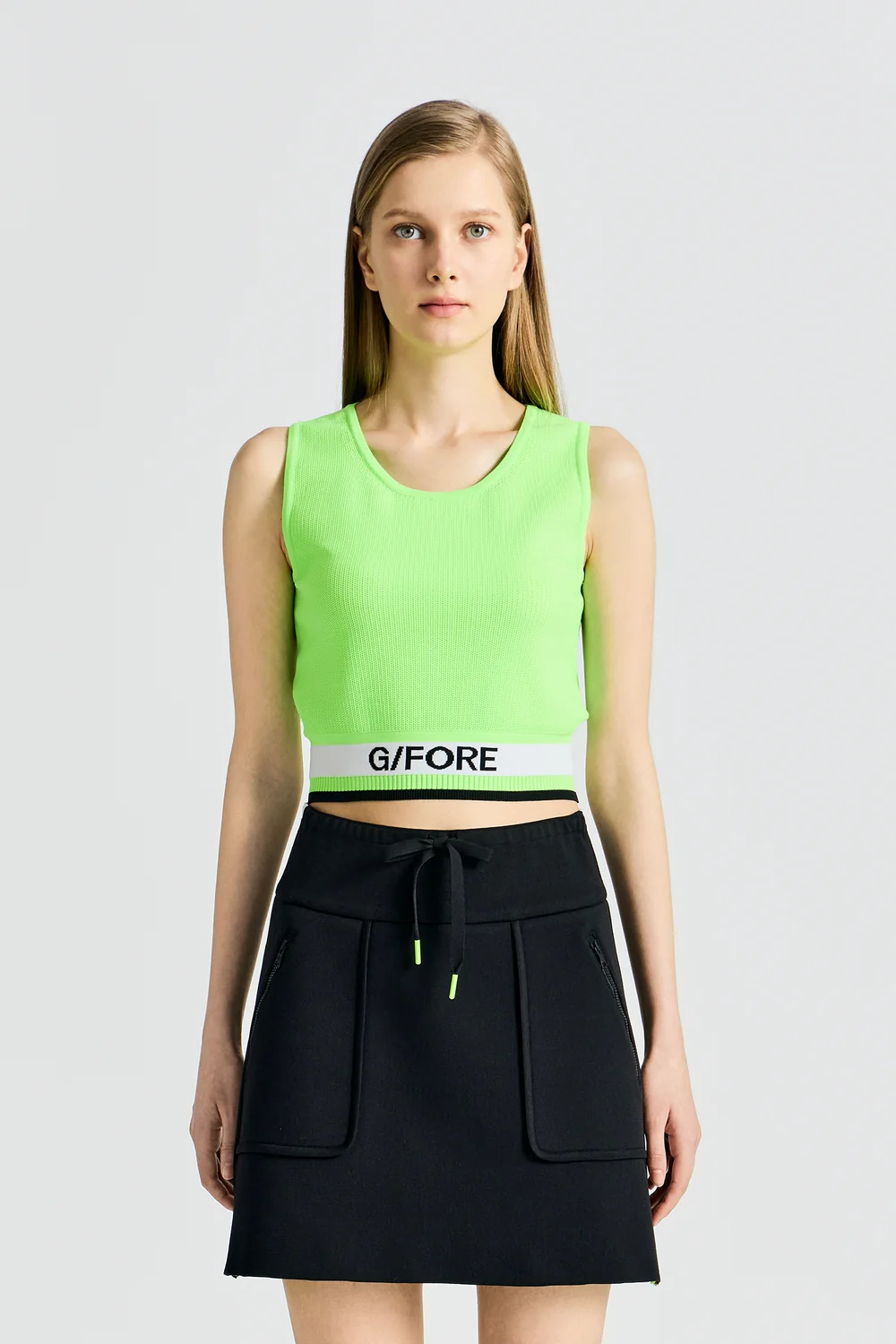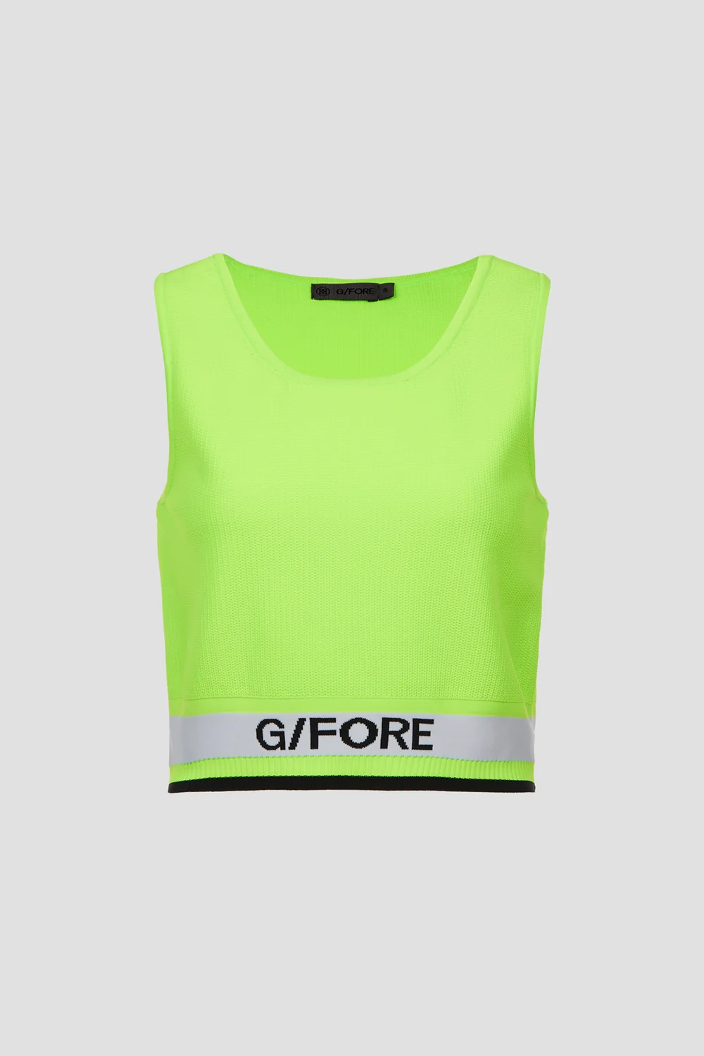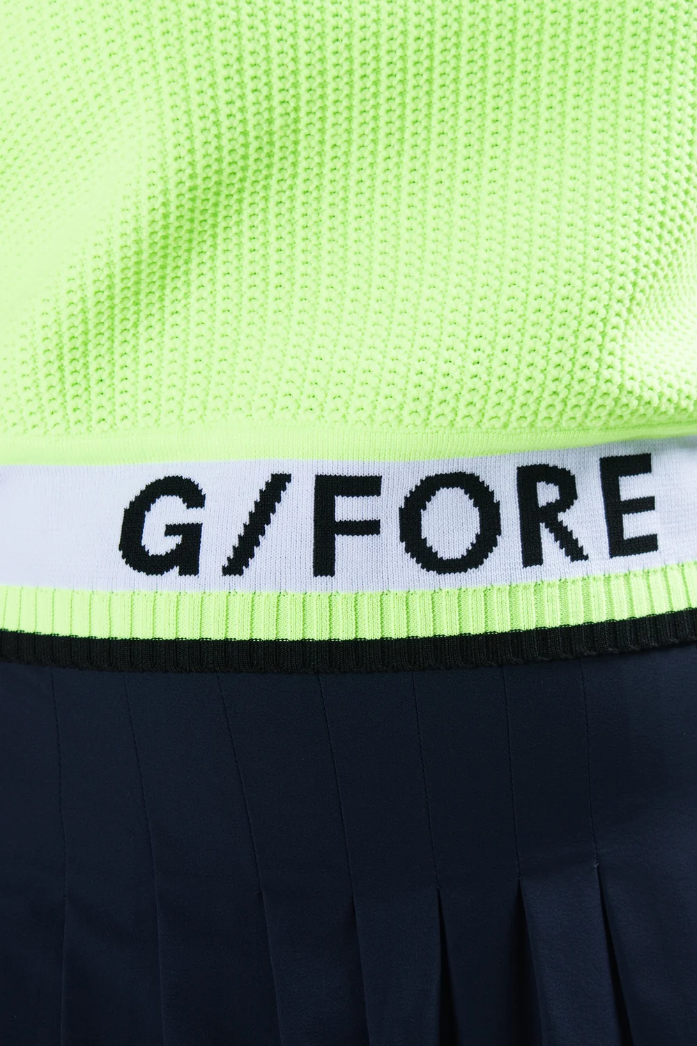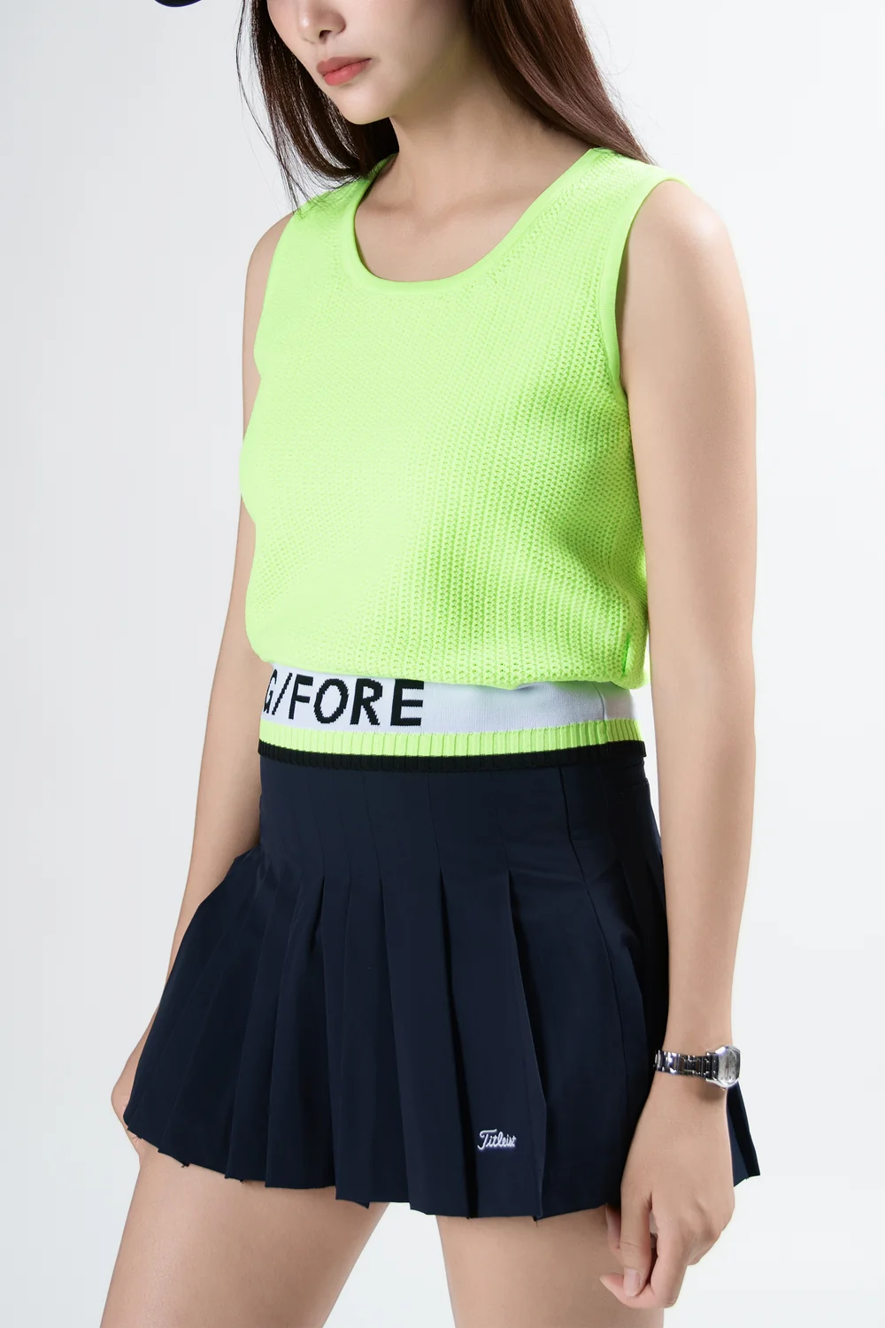 전체 이중 메쉬 조직으로 제작된 크루넥 디자인의 슬리브리스 스웨터.