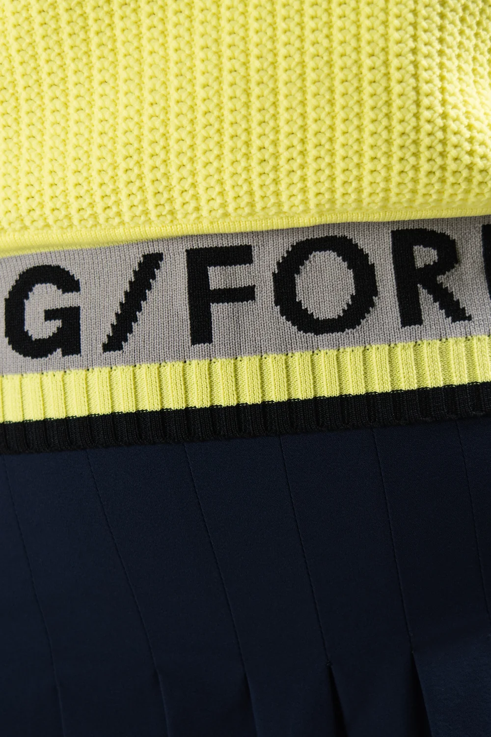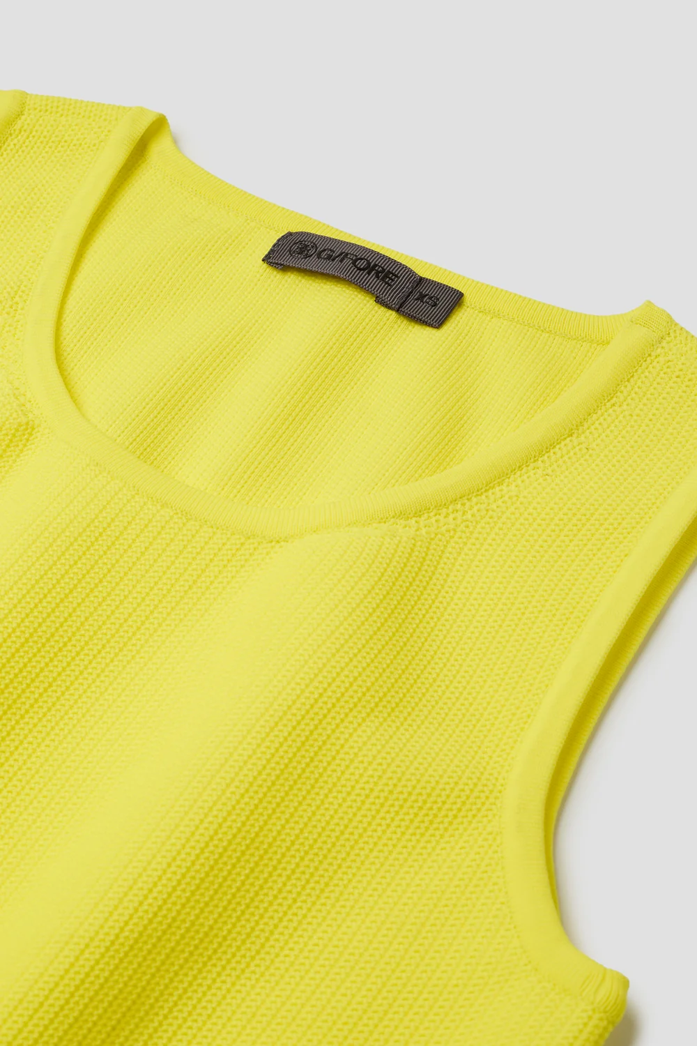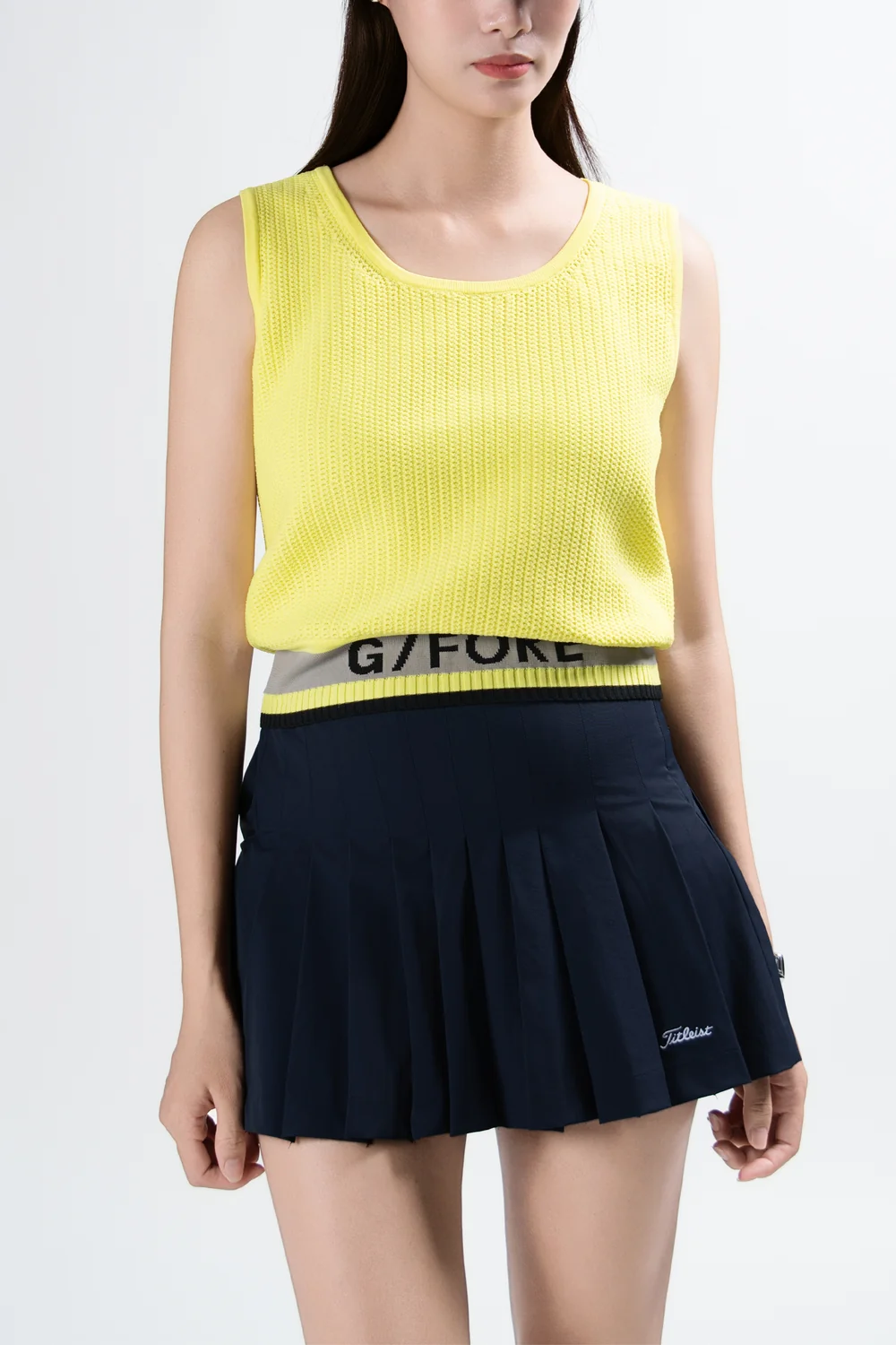 전체 이중 메쉬 조직으로 제작된 크루넥 디자인의 슬리브리스 스웨터.