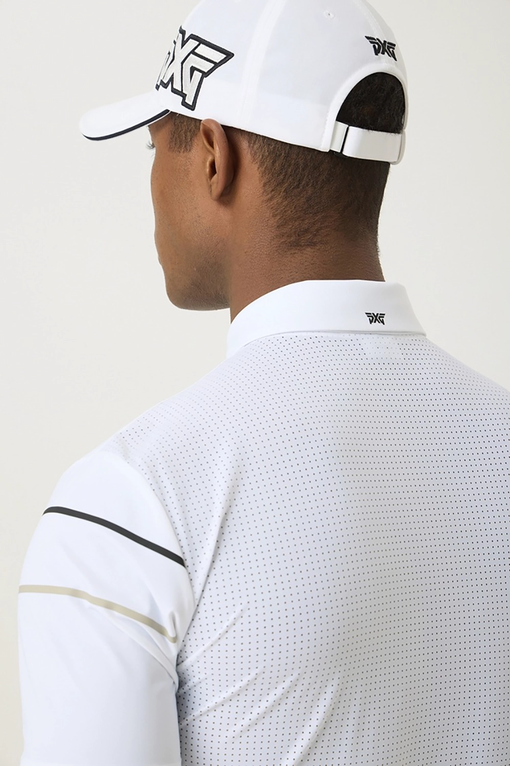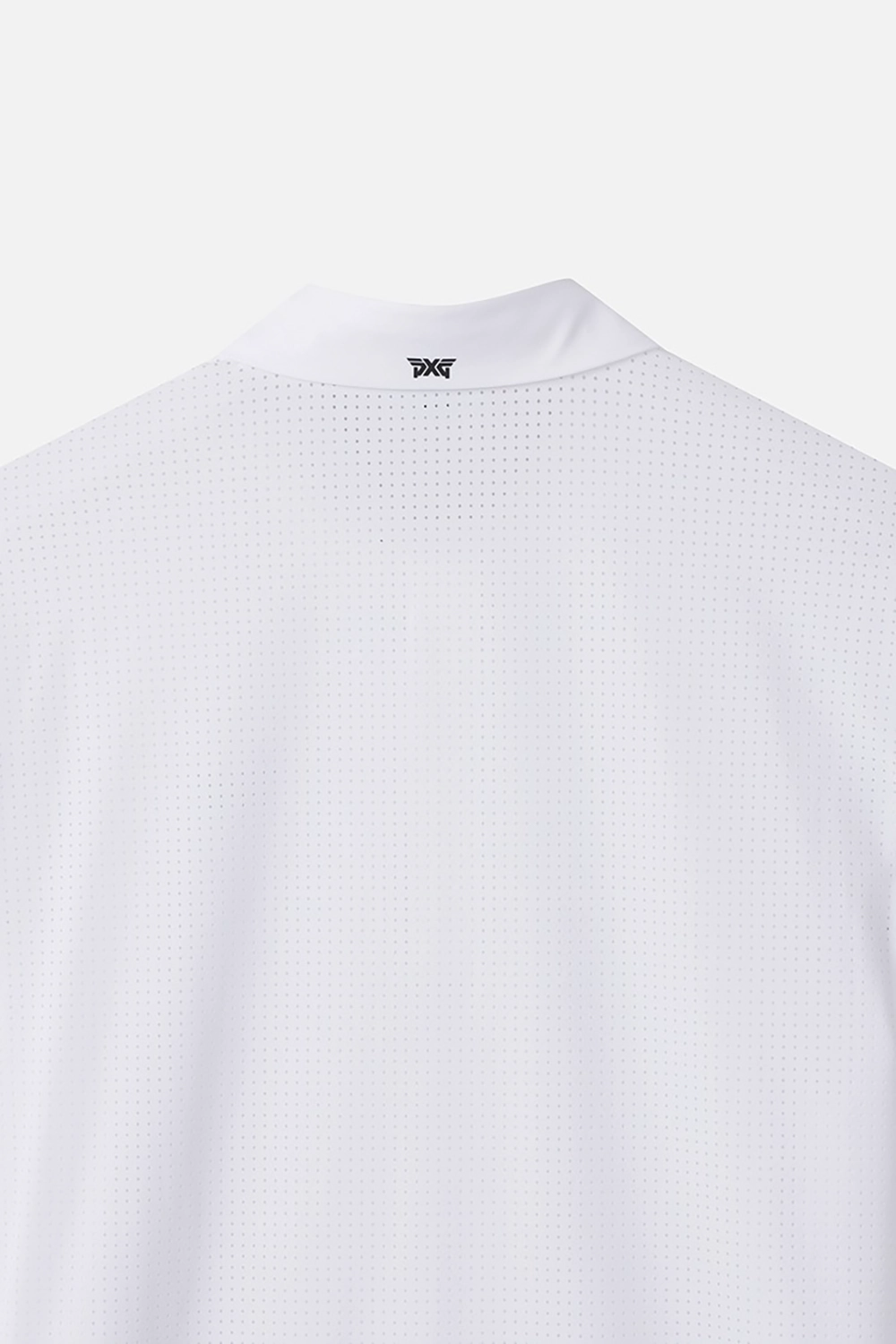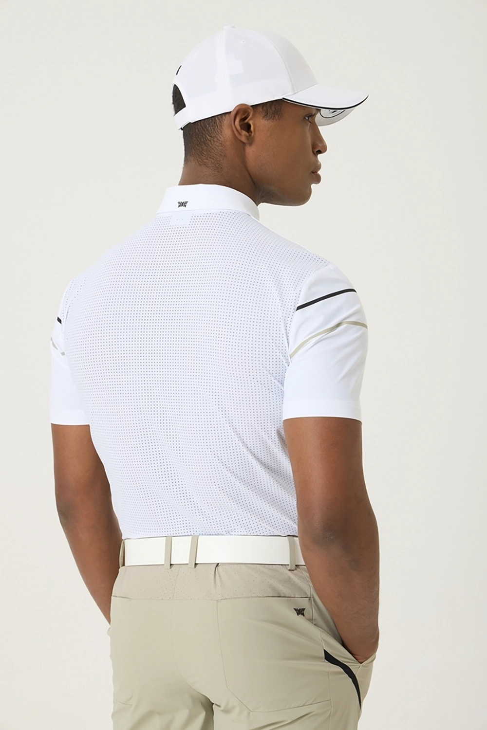 소매 프린트 배색 포인트를 사용하여 엣지있는 코디 연출 등 전체에 펀칭 원단을 사용해 벤틸레이션 기능성을 강화하여 한여름 라운딩에 최적화 된 아이템