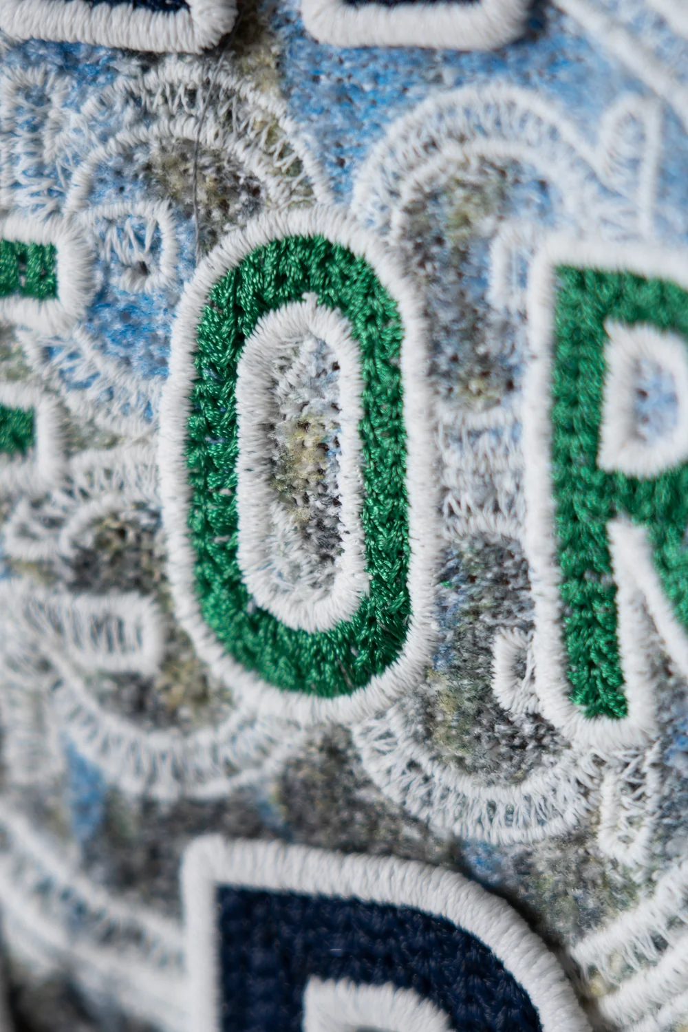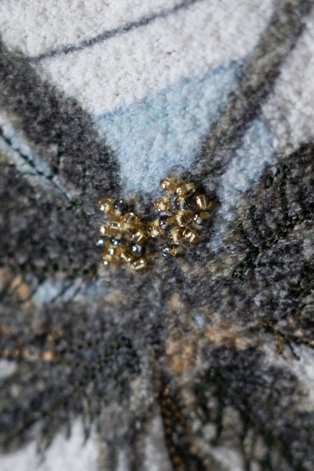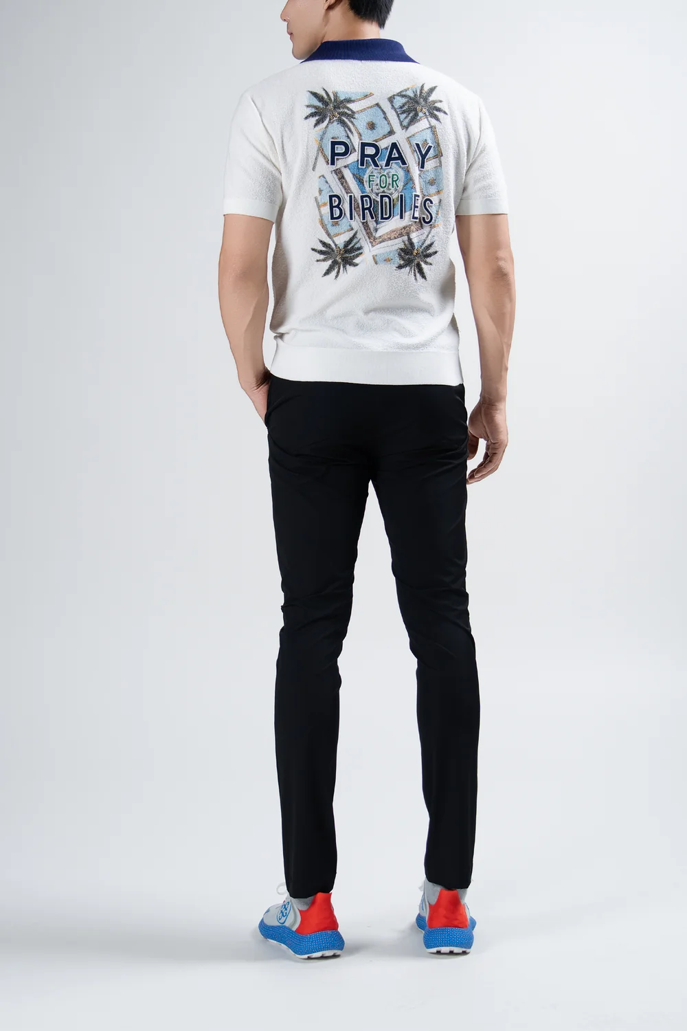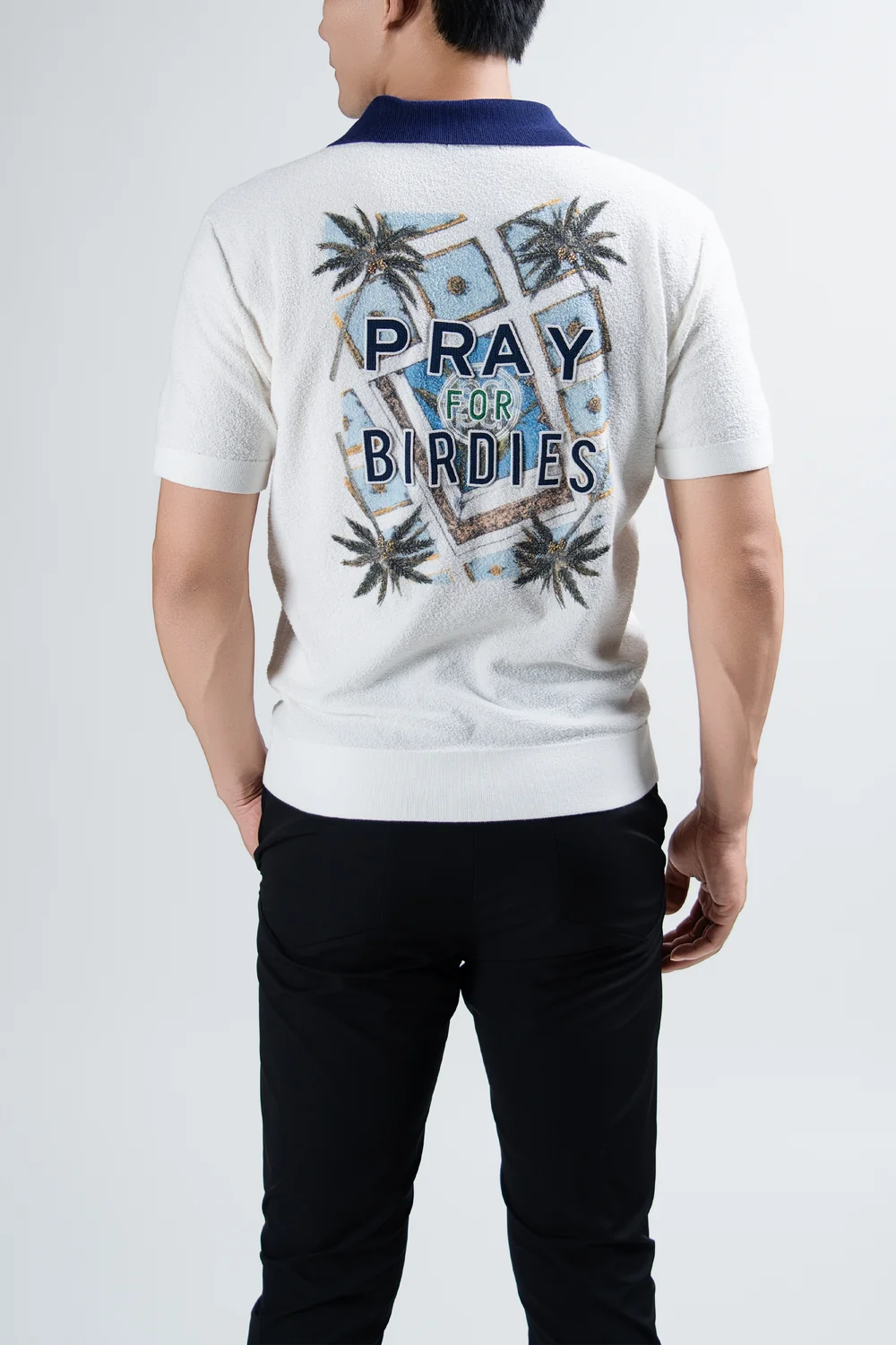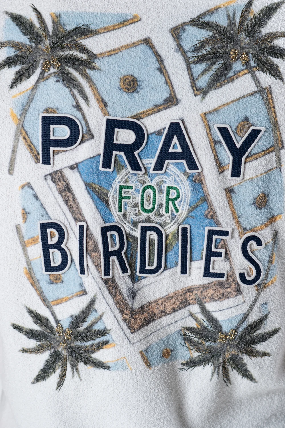 등판 PRAY FOR BIRDIES와 리조트 무드의 프린트 & 비즈 자수 믹스 기법의 아트웍이 특징인 감도 높은 포인트 아이템.