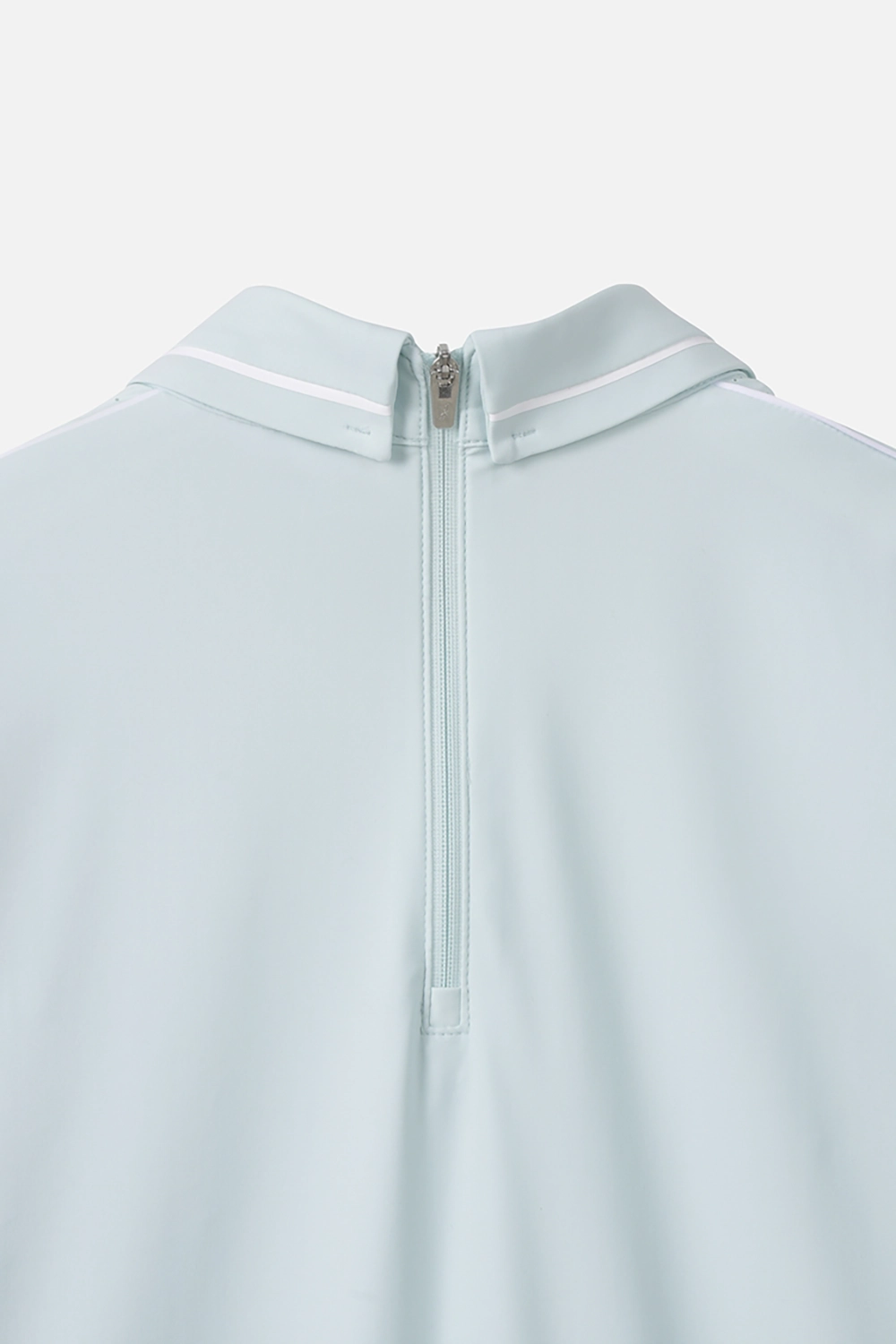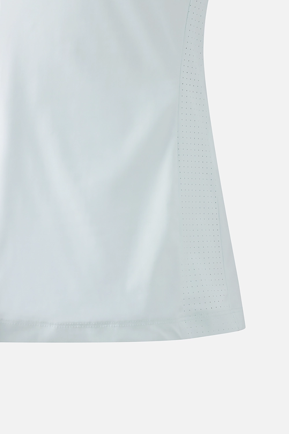 어깨선, 양 옆 허리 라인을 따라 타공소재를 믹스하여 통기성 강화